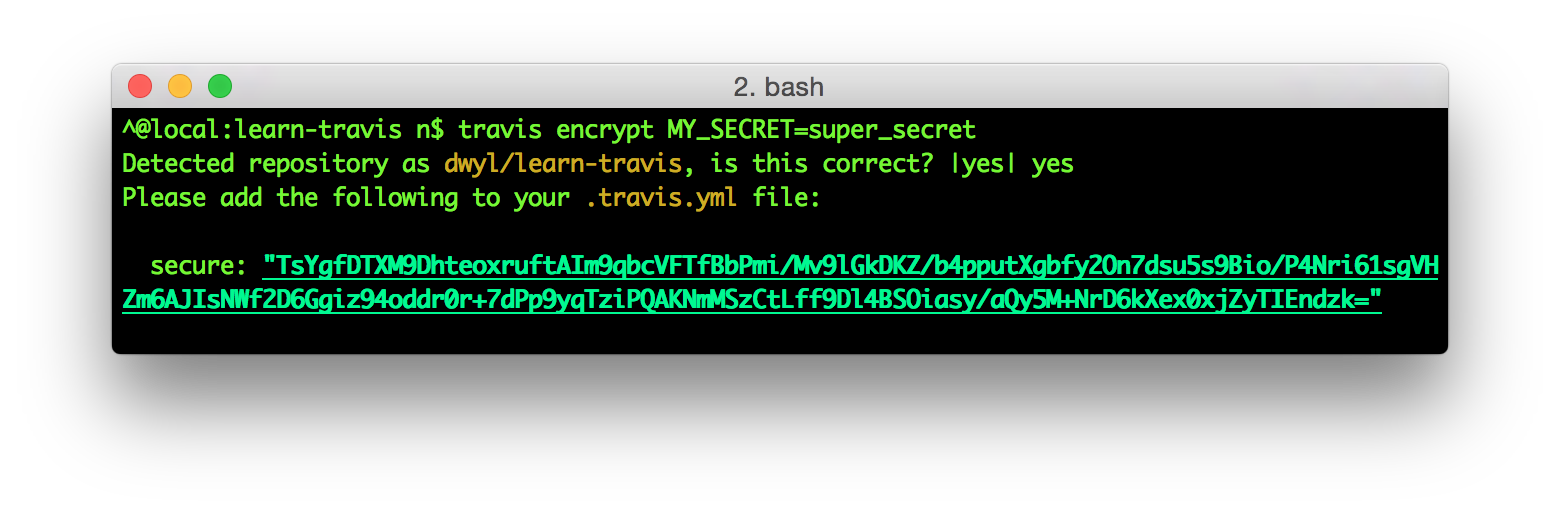 travis encrypt MY_SECRET=super_secretType yes to confirm you are your project, you should now see your encrypted variable: