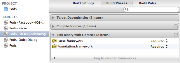 You HAVE to use the QuickDialog with the specific podspec because I've had to slightly modify the way values are saved out of elements in order to work with Parse's SDK. There also seems to be a bug in CocoaPods where frameworks aren't linked to dependancies, so you may need to manually go in and link Parse.framework (found in Pods/Parse/) to Pod-ParseQuickDialog's build phase.