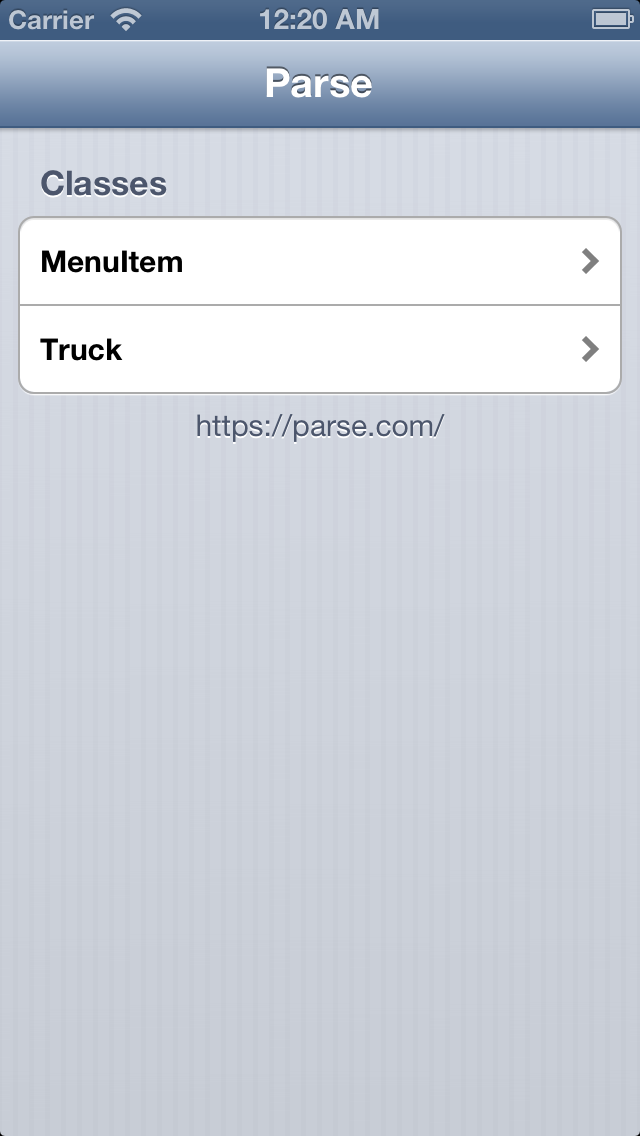 A listing of objects for a particular class. If provided with a titleKey, this listing will the objects' values for that key, next to their objectId. This is what is opened when you make a selection in the ParseClassesViewController. You can also create one manually with