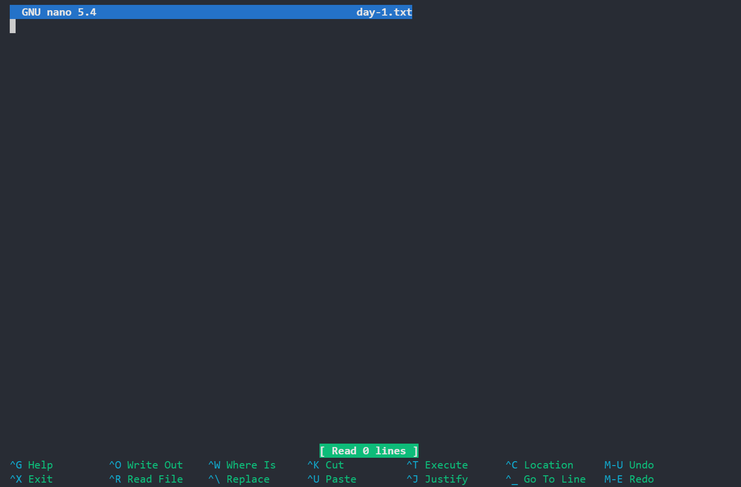 Now, let's open the day-1.txt file and add some text to it. We use the nano command to open and write.