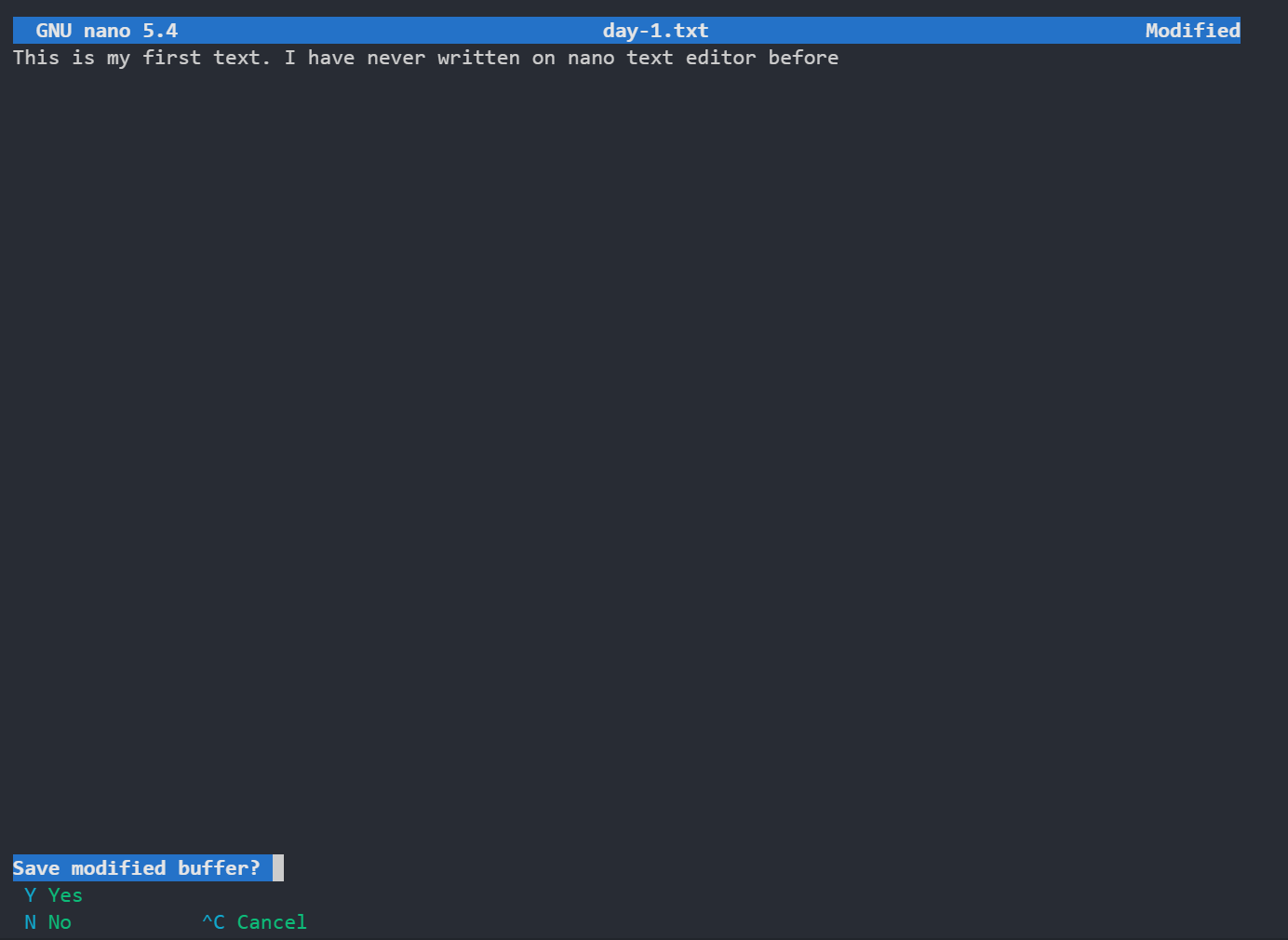 This is my first text. I have never written on nano text editor beforeLet's have day-1-backup.txt from day-1.txt by copying using the cp command.