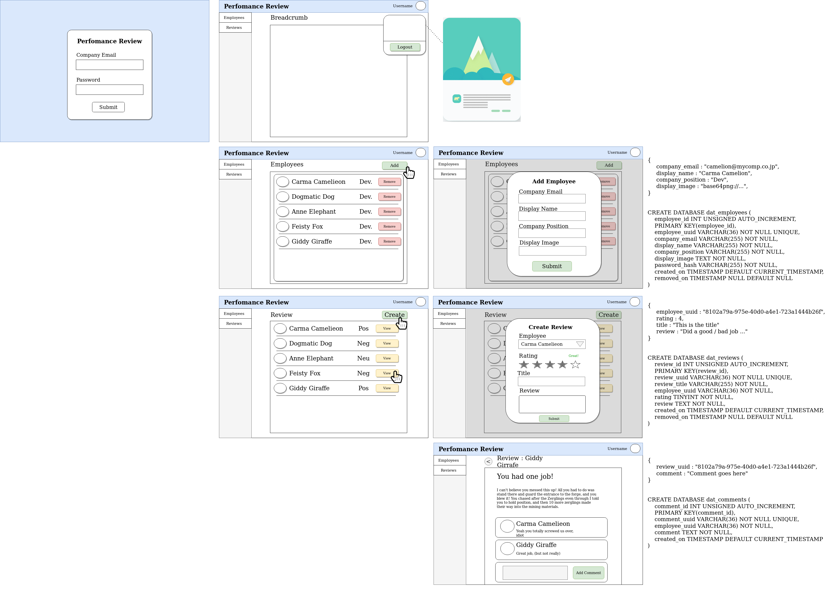 Before getting started this was the image I drew in diagrams.net to plan out the application. The idea is to have a login to differentiate which user is logged in, and then have two main pages. One page for the employee list, and the other for reviews. Employees and reviews are added via a modal form. And comments are implemented in a comment section when viewing a single review.