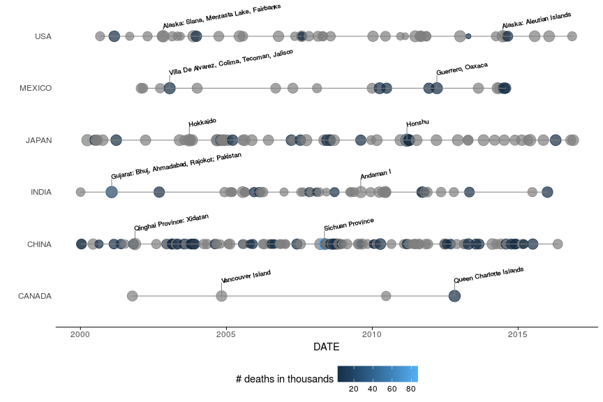# at the midpoint of the period.Once the data was tidied, rnoaa includes two ggplot2's geoms to visualize the timeline in which the quakes have ocurred and label the ones with the greatest magnitude: