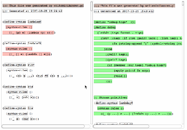 diff-lisp demos/mk1.ss demos/mk2.ssIt will produce a HTML file named "mk1-mk2.html" in the current directory.