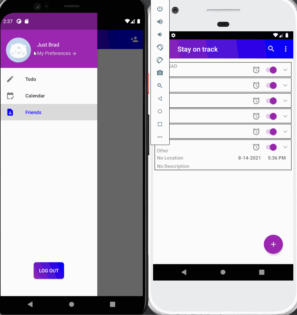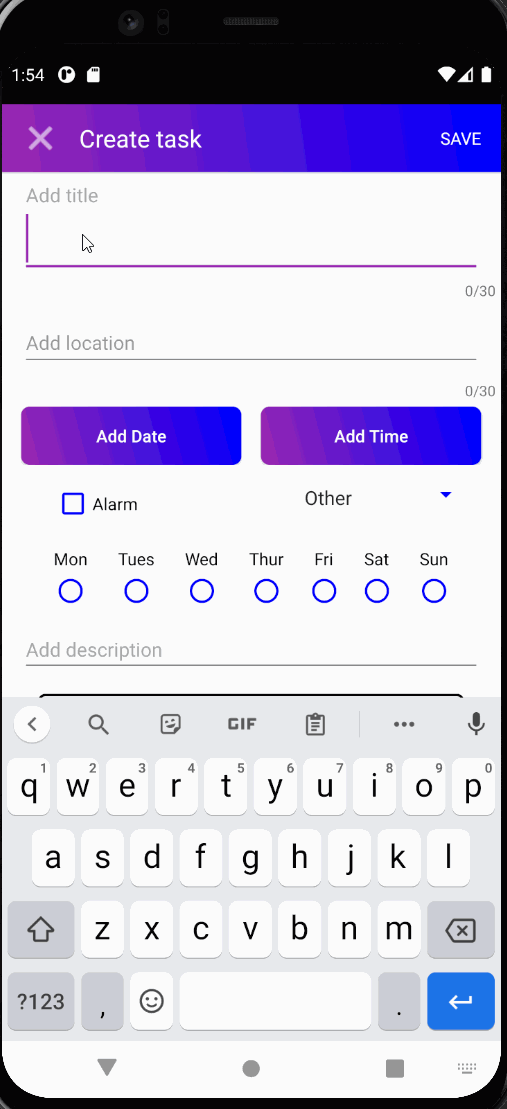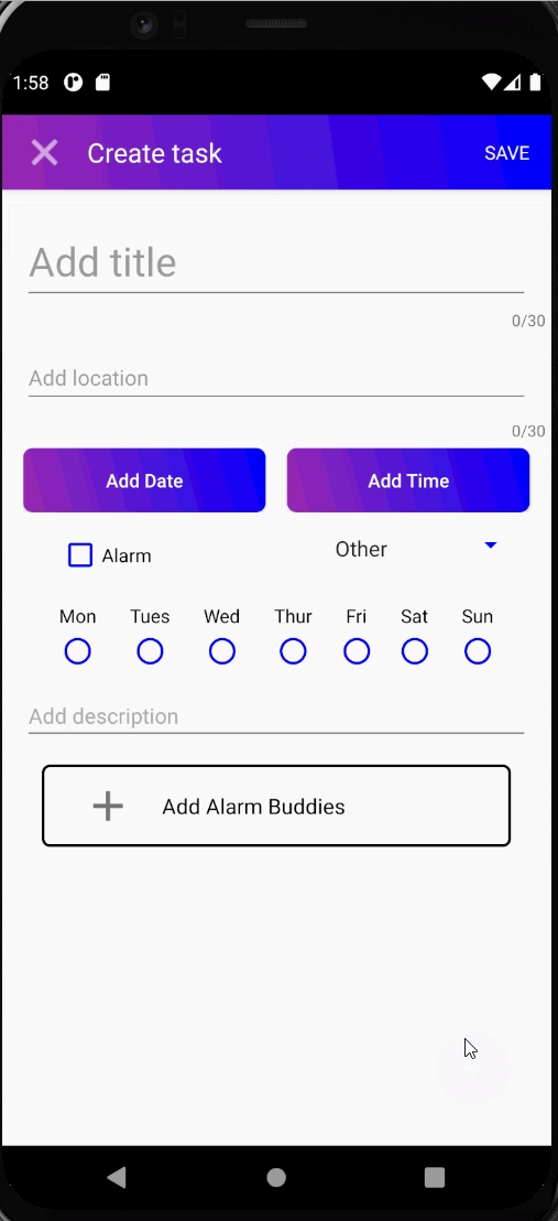 As a user (anonymous or logged in) you can create ToDo items specifically designated with a Name, Location, Description, Category, Time, Date, Alarm, and Recurring Times. If an Alarm is to be set the user is required to enter a Time and a Date in the creation screen. Alarm Buddies allow the user to add friends to alarms they create for group activities, however, this feature is only possible for logged-in users. Below are two gifs showing ToDo creation with and without an Alarm.