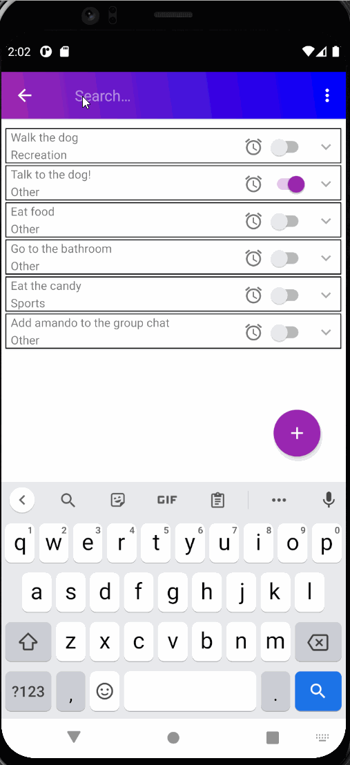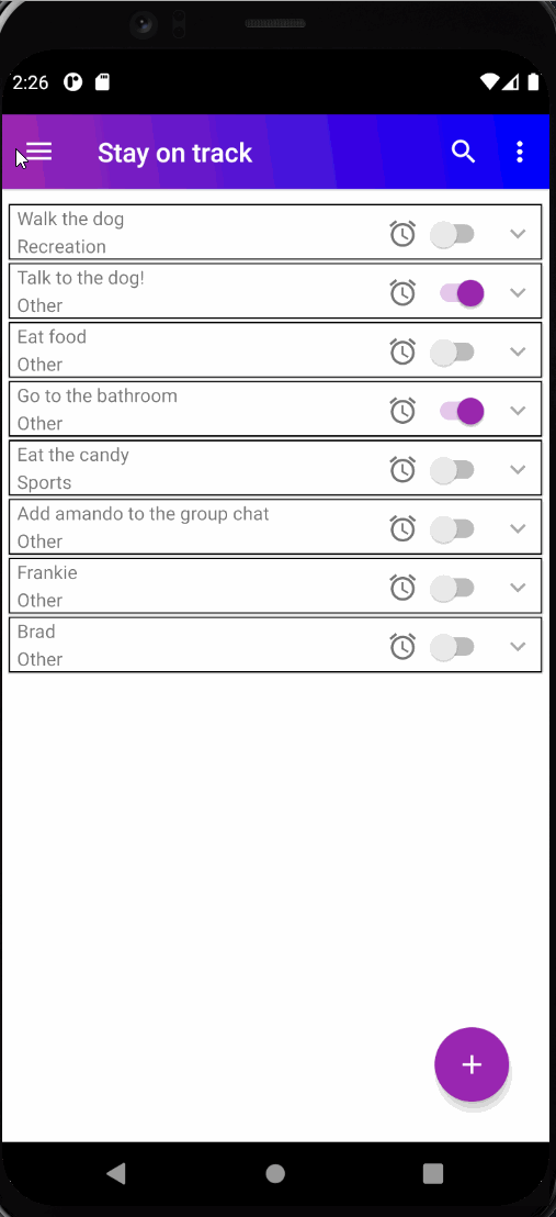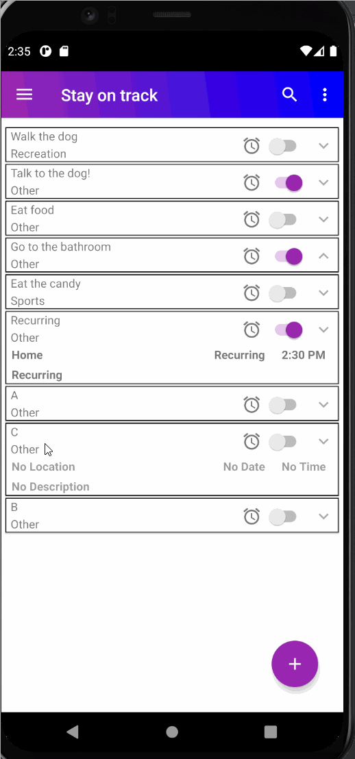 After creating alarms the user can choose to sort and update alarms after creation. The user can use a Search View to enter characters and find a ToDo item by the Name field of an item. This can also be paired with Sort By Alphabet + Category. A user can also choose to Update an existing task just by clicking on the item. The preset data will be already sent to the EditTask screen for the user to see. Below are two gifs showing the Sorting features and Update functionality.