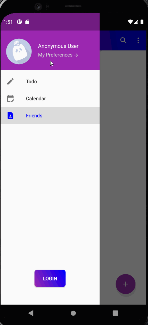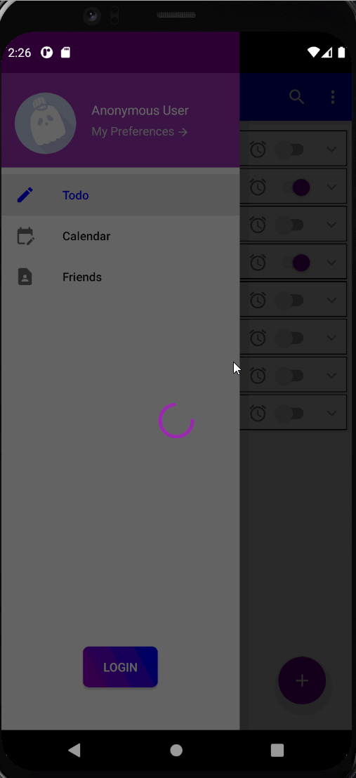 When the user first opens the application they are greeted with the Splashscreen showing out the icon and splash art. Then they are navigated to the main ToDo fragment which shows users their upcoming ToDo items. When first opening the app the user is logged into an anonymous user account which can use the majority of the ToDo item features, such as setting alarms. However, an anonymous user cannot add friends, and interact with the social features of the application. Below are two gifs showing the SplashScreen activity and the anonymous user functionality.