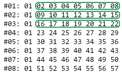The second cycle builds all the remaining series by placing the elements number 2, 3, 4, 5 and so on (up to N) in the first position and then filling them with the other elements in ascending order: however, this time the progression develops vertically (from top to bottom) to be sure to “intersect” once (and only once) any series generated during the first cycle. It goes without saying that the first series must be skipped by such progression, since it contains the first 8 elements which are used as “first position” by all the other series.