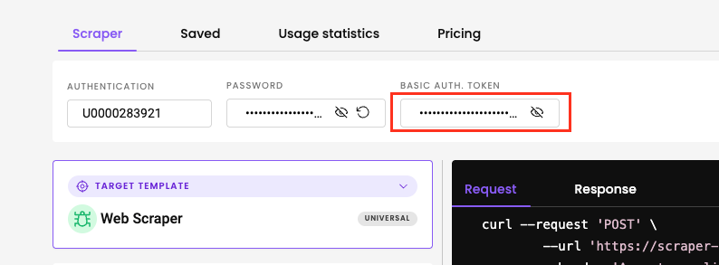 Once you have a plan activated, take a note of your generated authentication token from the Web Scraping API page:
