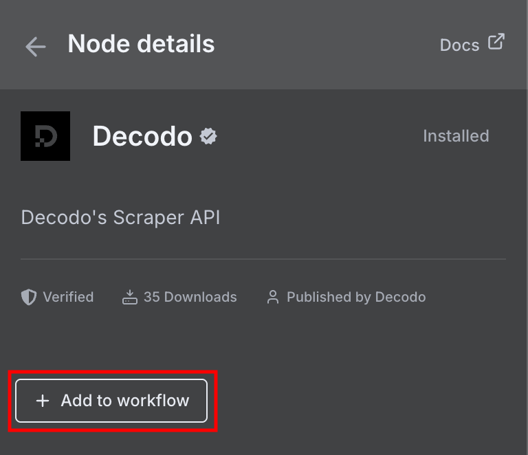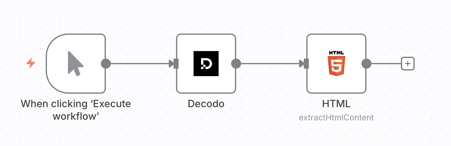 - Easy integration. Plug the Decodo's n8n node into existing workflows to start scraping with minimal setup.