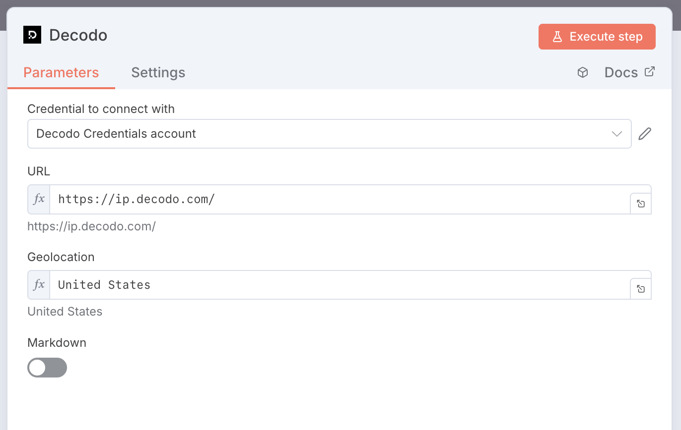 To use the Decodo node by itself, connect it to an existing workflow. Once you add it, you can set the target URL and Geolocation.