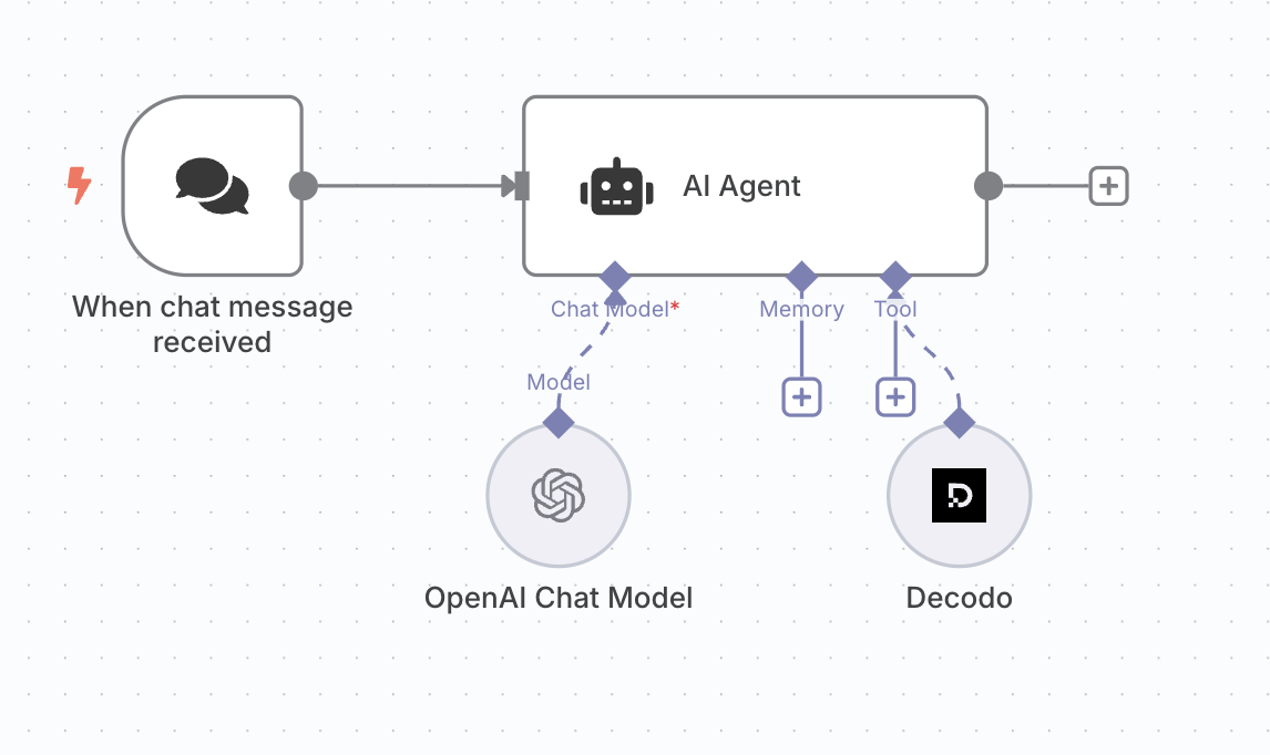 You can connect the Decodo node to the AI Agent node as a tool. You don't need to modify anything inside the node. Here's what a simple setup would look like: