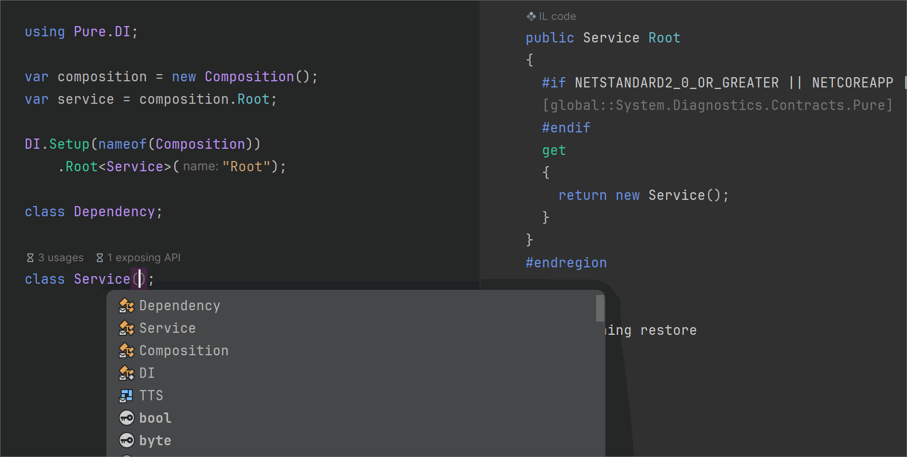 The Pure.DI API is intentionally designed to closely mirror the APIs of mainstream IoC/DI frameworks. This approach ensures developers can leverage their existing knowledge of dependency injection patterns without requiring significant adaptation to a proprietary syntax.
