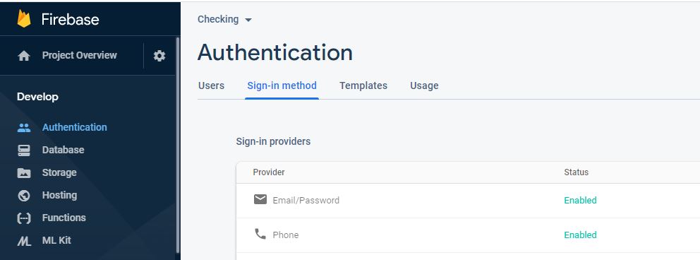 Step 5: Open the Authentication under Project Overview in Firebase and then enable the sign-in method with email/password and phone.