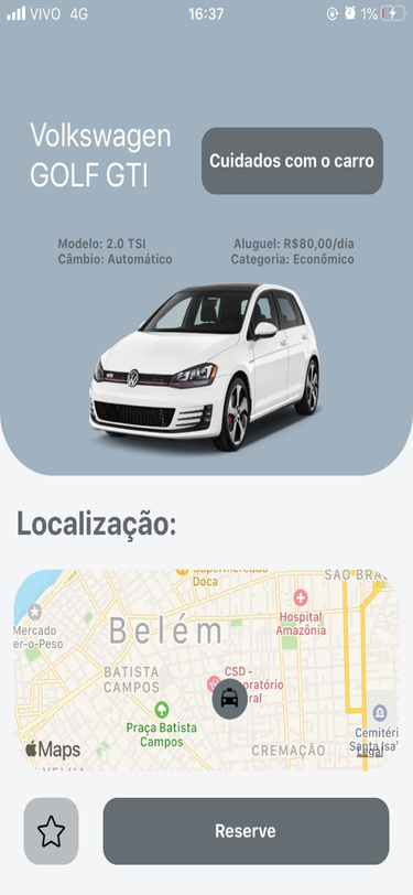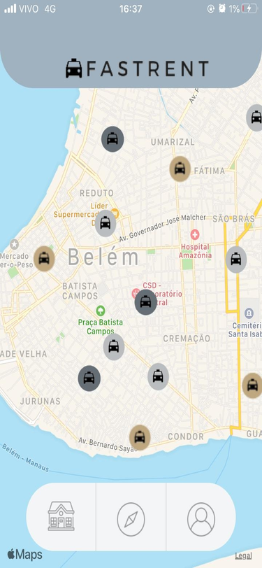 - Mapa de Busca com carros de diversos tipos de planos disponíveis para aluguel, assim como opções de busca para os mais próximo de você: