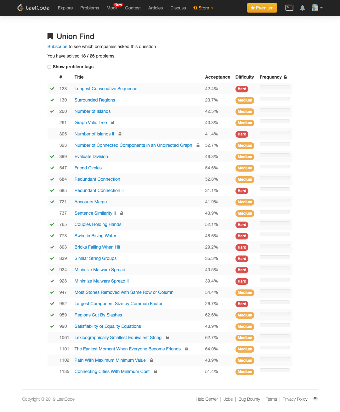 • 灵活使用并查集的思想,熟练掌握并查集的模板,模板中有两种并查集的实现方式,一种是路径压缩 + 秩优化的版本,另外一种是计算每个集合中元素的个数 + 最大集合元素个数的版本,这两种版本都有各自使用的地方。能使用第一类并查集模板的题目有:第 128 题,第 130 题,第 547 题,第 684 题,第 721 题,第 765 题,第 778 题,第 839 题,第 924 题,第 928 题,第 947 题,第 952 题,第 959 题,第 990 题。能使用第二类并查集模板的题目有:第 803 题,第 952 题。第 803 题秩优化和统计集合个数这些地方会卡时间,如果不优化,会 TLE。
