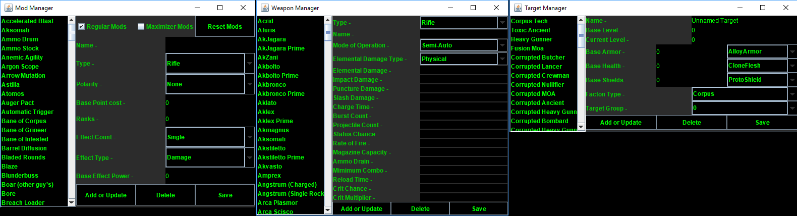 WWDC has most weapons and mods already added, but you may want to add your own (Rivens, Kitguns, higher level enemies, etc). Accessed by clicking the respective labels at the top of the application. Click "Add or Update" when finsihed with an entry, then "Save".