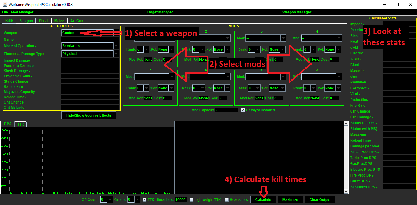 - Theoretical times it takes to kill selected targets (calculated after hitting the calculate button)