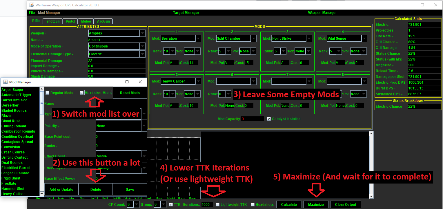 This will test every possible combination of mods in mod slots you leave empty and present the most effective builds against your selected targets. Very CPU intensive.