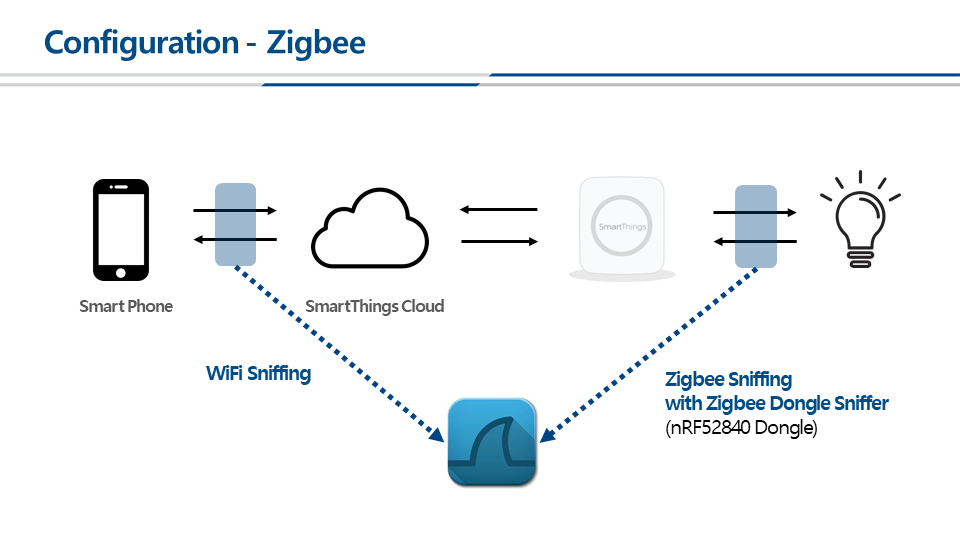 우리는 이 구간 중 smartPhone과 cloud간의 wifi구간과 hub와 Wafer의 Zigbee구간에 대해 sniffing을 진행했다.