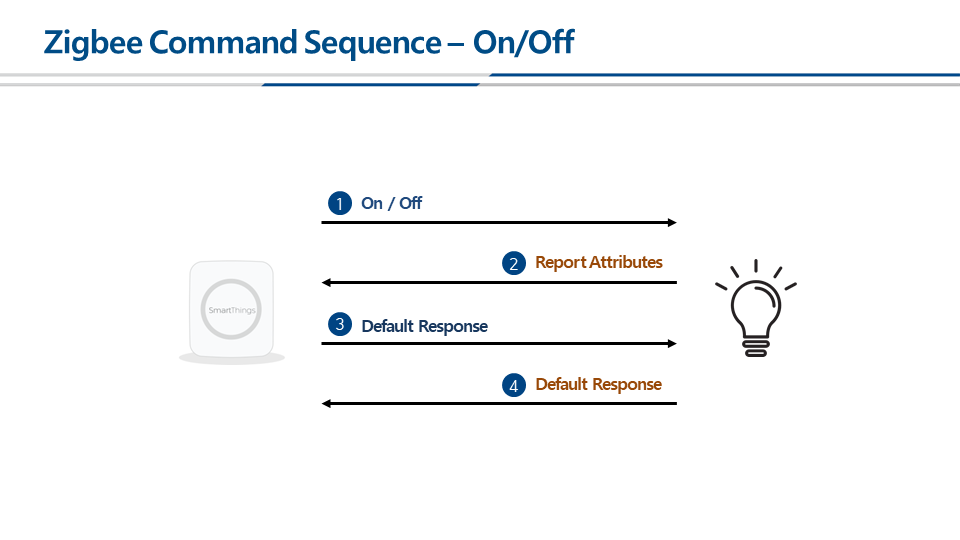 SmartPhon에서 LED ON이라는 요청을 보내면, 이 요청이 SmartThings Cloud로 가게 된다. 그리고 Cloud로 들어온 Command는 Hub로 전달된다. Hub에서 이 요청을 Wafer에 Zigbee로 보낸다. Zigbee 통신에서 SmartPhone과 SmartThings Cloud간의 통신은 wifi로 이루어지고, Hub와 Cloud간의 통신은 Zigbee로 이루어진다.