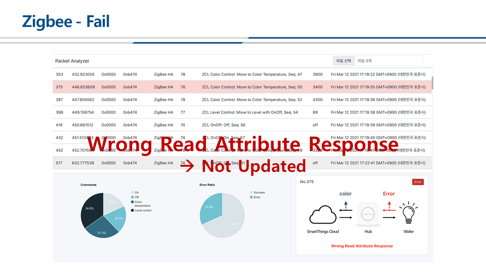 - Report attribute에서 LED상태가 변경되지 않았을 경우 – LED가 command에 따라 update되지 않았으므로, 에러