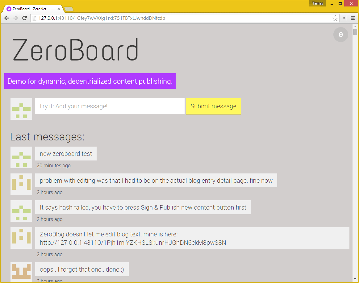 Simple ZeroNet messaging board demo for dynamic, decentrialized content publishing.