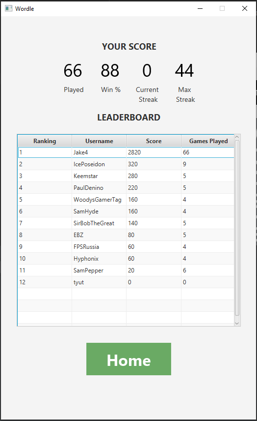 This is a wordle recreation in Java that uses JavaFX for the UI. This was created for my first year Computer Science 'CT4030 - Object Oriented Programming' Assignment. This clone also has a login system which allows scores to be stored in a SQLite database.