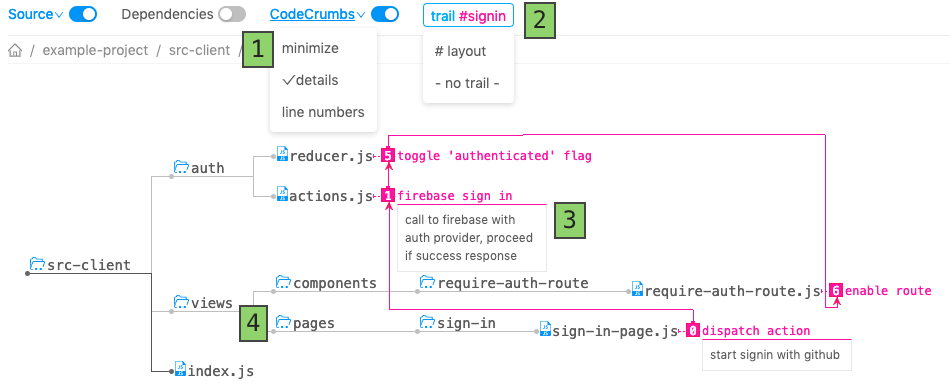 How it works? You run codecrumbs command for a codebase, it analyzes source code and builds its visual representation. Write down a codecrumb-comment and codebase state will be reflected by visual client in browser on the fly.