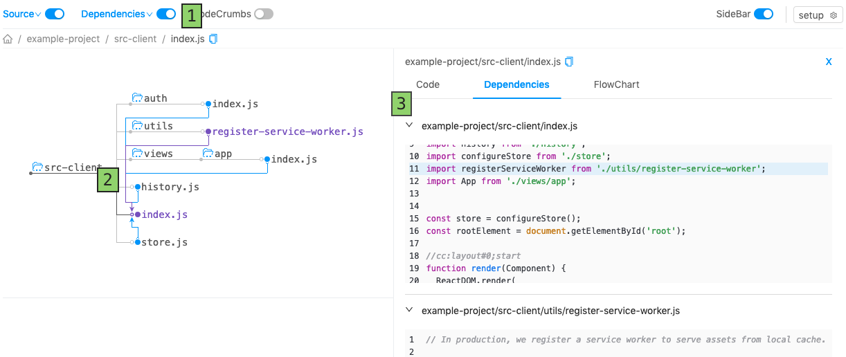 2. Run codecrumbs -d project-src-dir -e project-src-dir/index.js. Change parameters to match your project:-d is directory with source code, -e is entry point file .