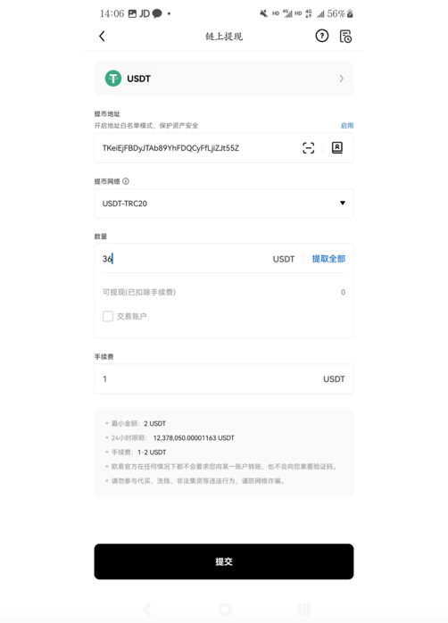 2. 打开上面第2步注册的欧易App,找到首页——资产——提币——USDT——链上提币,