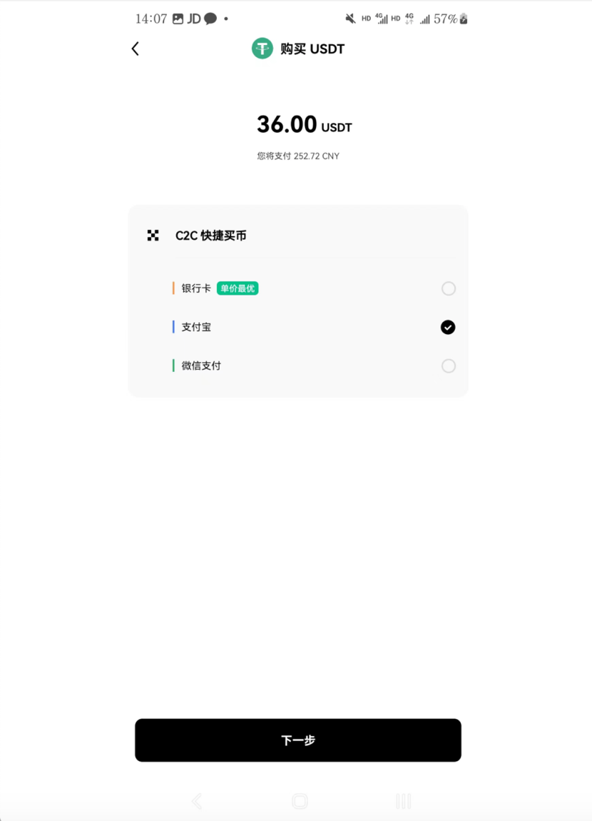 耐心等待欧易App安装成功,点击App首页——我要买币——快捷买币——选USDT——购买至少23USDT(大概¥200)——支持支付宝、微信或者银行卡购买。做完上面这一步,就完成人民币——USDT的兑换。这里,我多买点,买36USDT,大概250人民币。