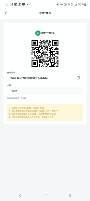 - 打开Depay App钱包,找到钱包——USDT——充币——复制你的充值地址,确认屏幕上显示主网是TRC20,充值地址千万不要复制错,比如我的Depay钱包的USDT充值地址是TKeiEjFBDyJTAb89YhFDQCyFfLjiZJt55Z。