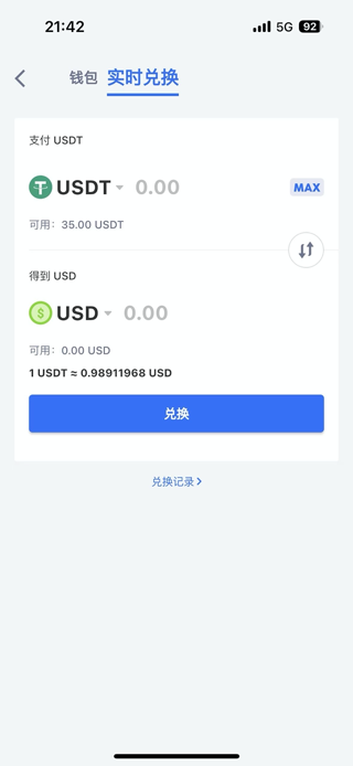 3. 欧易提现到Depay成功后,点击Depay App钱包——兑换,将所有的USDT都兑换成USD美元