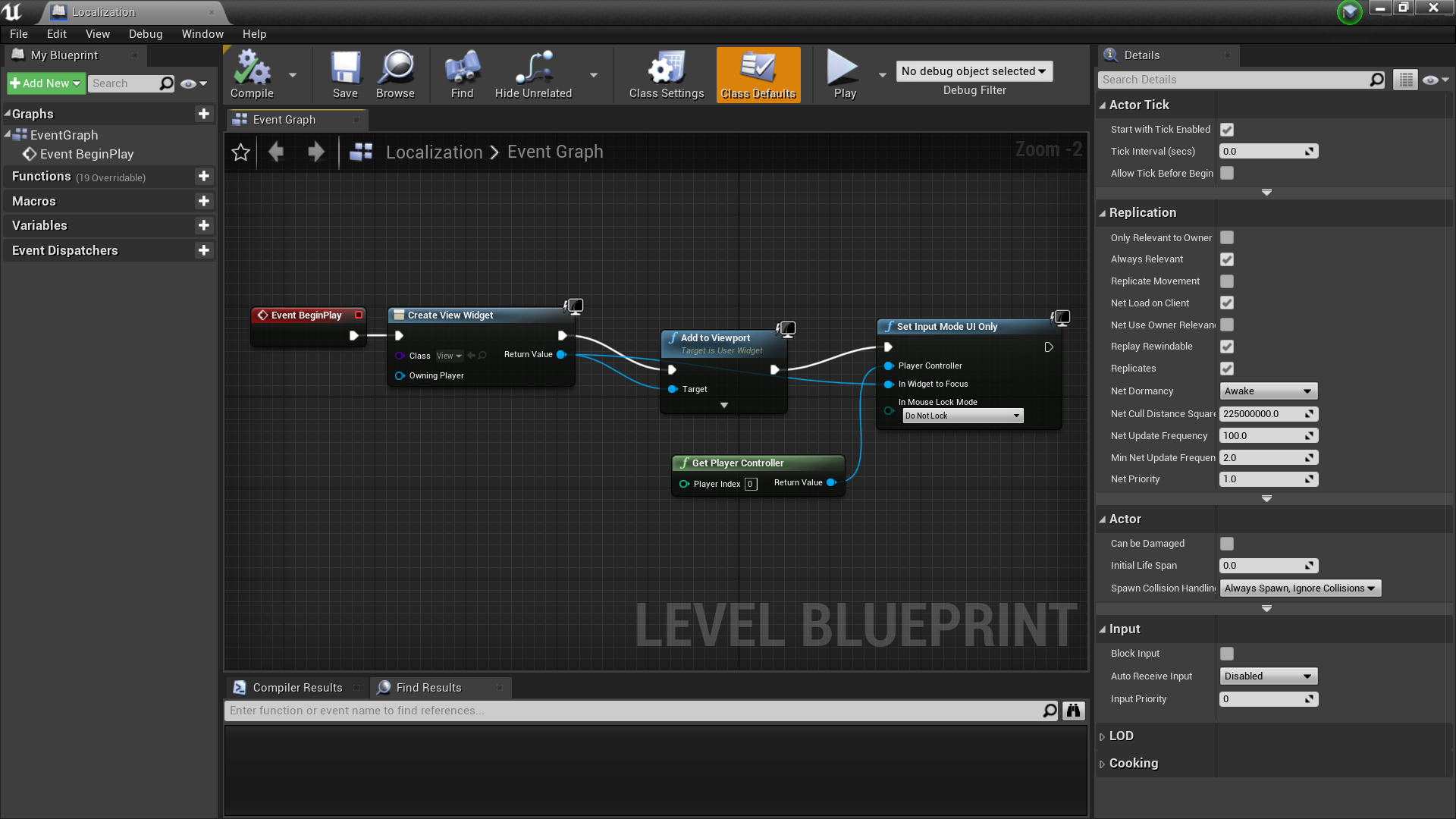 TestLevel - Level Blueprint: Creates aWidgetfromNoesisBlueprint'/Game/MainWindowView.MainWindowView', adds it to the viewport and captures mouse input. It also creates several instances ofBlueprint'/Game/Language.Language'and an instance ofBlueprint'/Game/ViewModel.ViewModel'that it sets as theDataContextof theWidget.
