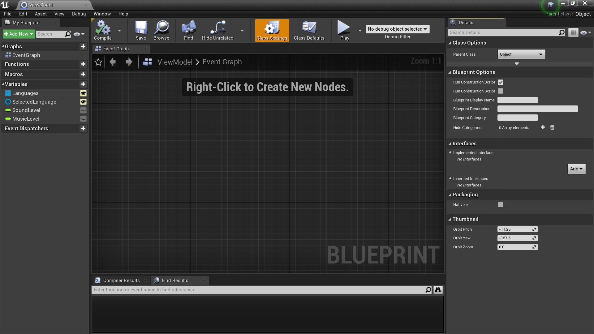 Blueprint'/Game/ViewModel.ViewModel': AnObjectthat is used as theDataContextforNoesisBlueprint'/Game/MainWindowView.MainWindowView'. It exposes the list of supportedLanguagesand the currentlySelectedLanguage, as well as the previously mentionedSoundLevelandMusicLevel.