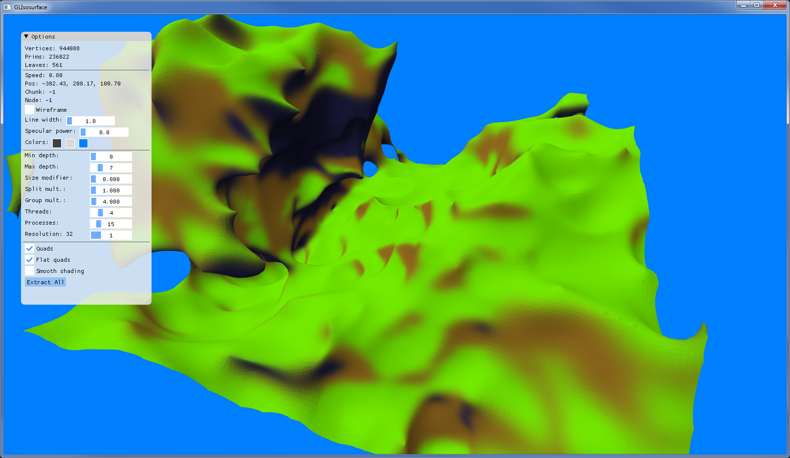 Speed is the biggest priority, and as such it's gone through many stages of optimization. Thanks to FastNoiseSIMD (linked above), generating noise is doable for fast fly-bys throughout the world. It also relies on pooling memory, multithreading, and clever bit tricks to speed up chunk extraction (see the article linked below for details) and run smoothly on any given hardware.