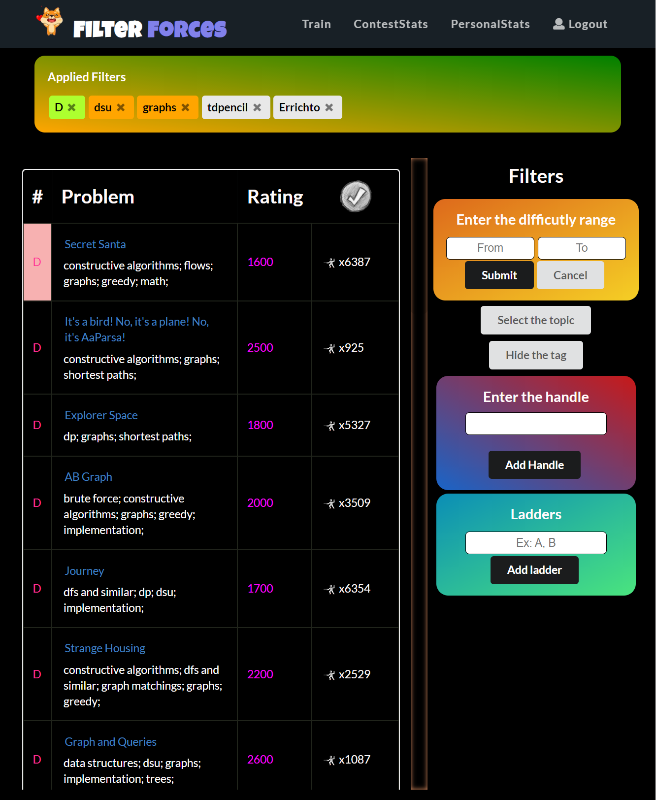 | Ladder Filter | ✔ | Ability to Filter the problems according to ladders (Ex: A,B) |