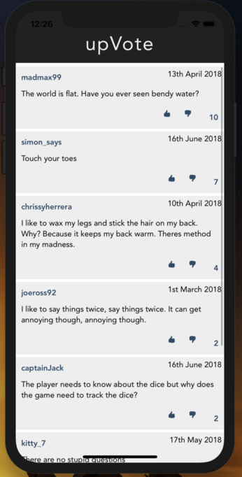 upVote Simple comments app which allows the user to 'up-vote' or 'down-vote' posts. Built using React Native it utilised the LayoutAnimation module.