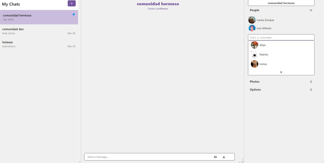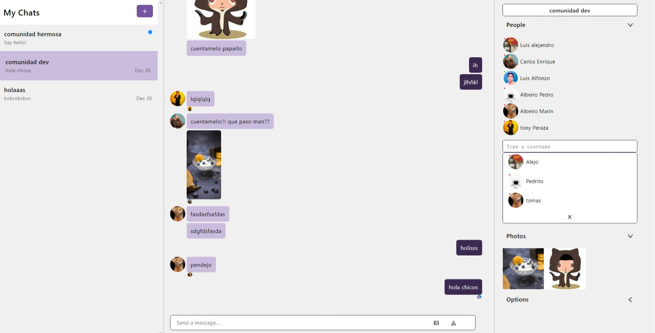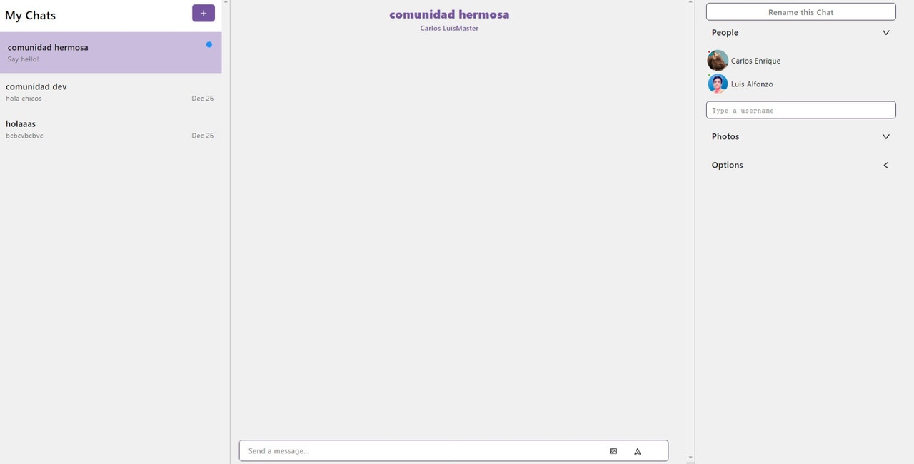 Es un chat muy simple hecho con React.js Node.js y el api de Chat Engine (https://chatengine.io/pricing) el cual me da todo un back practicamente para yo poder utilizarlo con much falicidad y para solo enfocarme en el front end de la aplicacion 100% recomendable