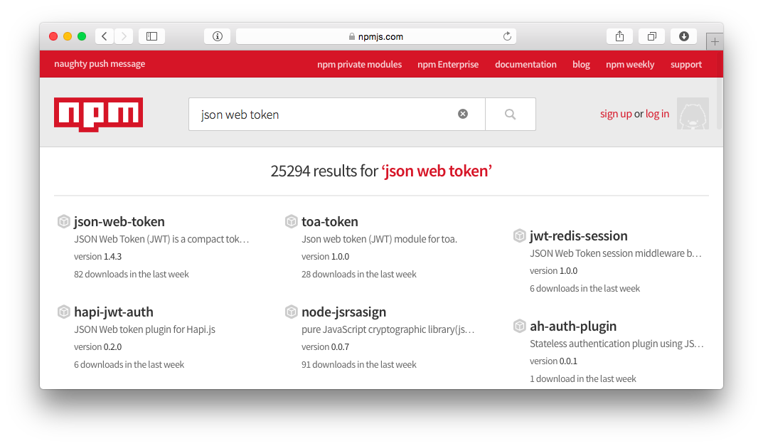 A search for "JSON Web Token" on NPM: https://www.npmjs.com/search?q=json+web+token yields many results!