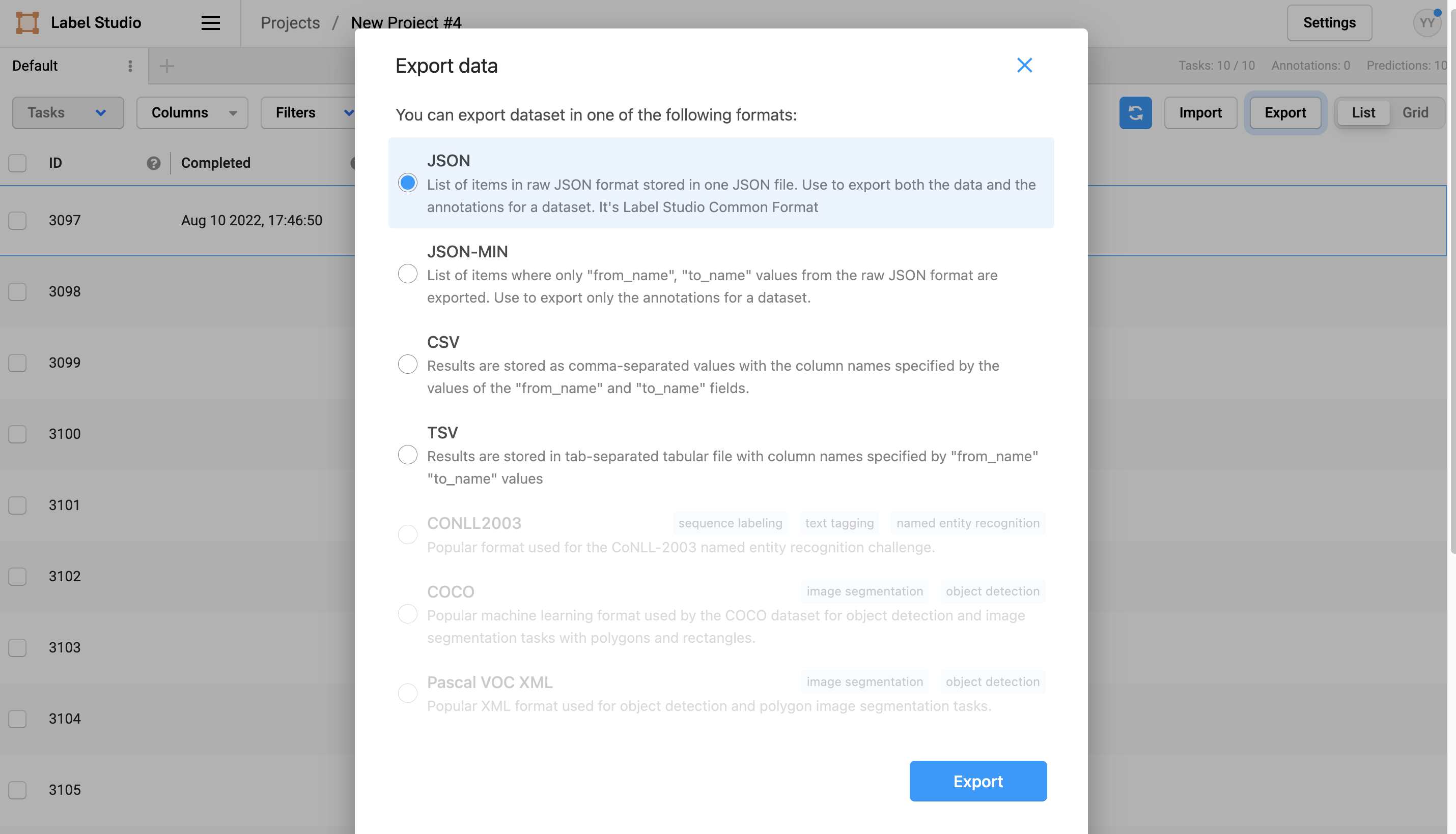 Import samples.json as an example. It contains 10 data samples. The imported file should be a json file and you can follow the format of this example file if you need to customize your own dataset.