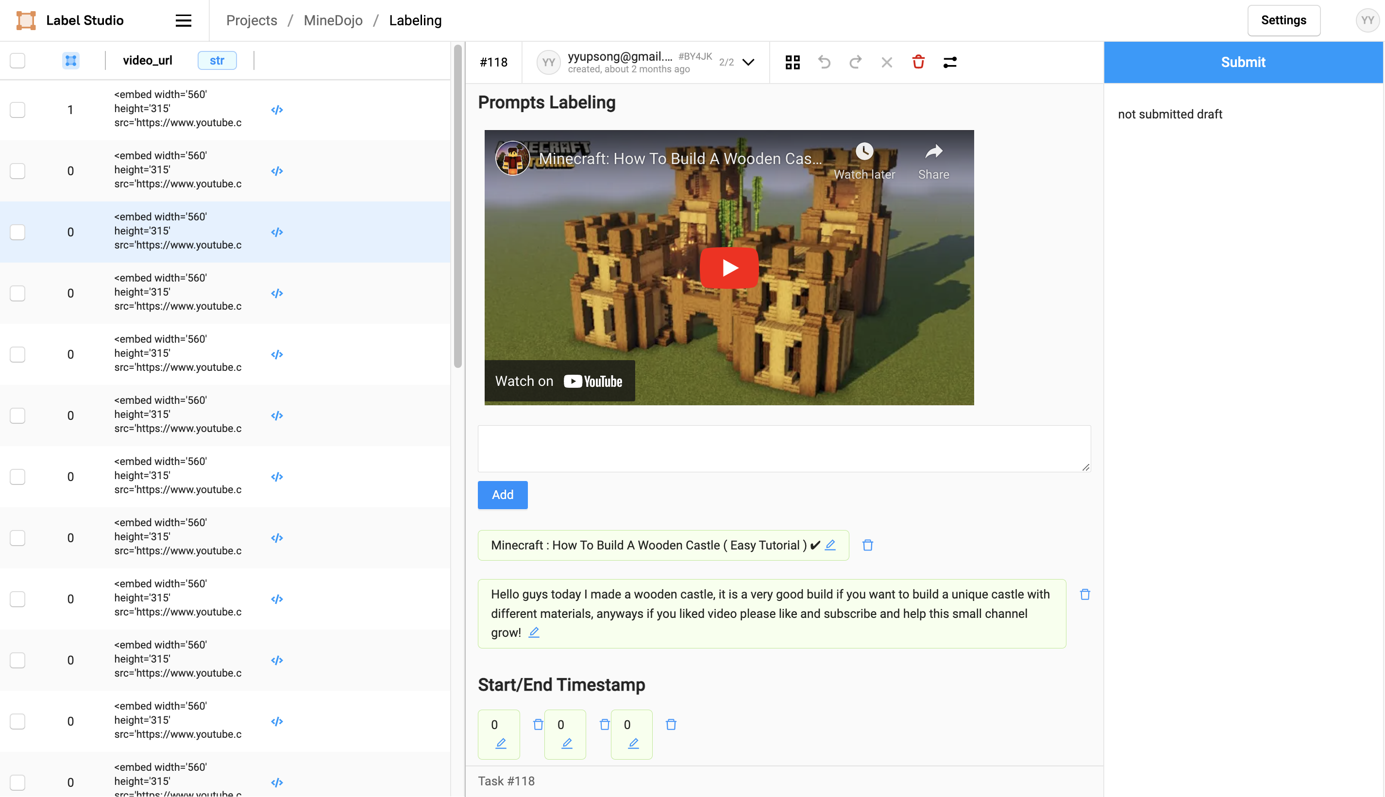 We identify our YouTube dataset as a rich source of tasks, as many human players demonstrate and narrate creative missions in the tutorial playlists. To collect high-quality tasks and accompanying videos, we design a pipeline that makes it easy to find and annotate interesting tasks (see our Arxiv paper for details). We design a task curation UI using Label Studio that displays the full video and YouTube description. A human annotator can choose to reject the video, adjust the timestamps, select the title, or refine the description to be the task goal. Through this pipeline, we extract more than 1,000 tasks from the common wisdom of a huge number of veteran Minecraft gamers. Some examples are "make an automated mining machine" and "grow cactus up to the sky".