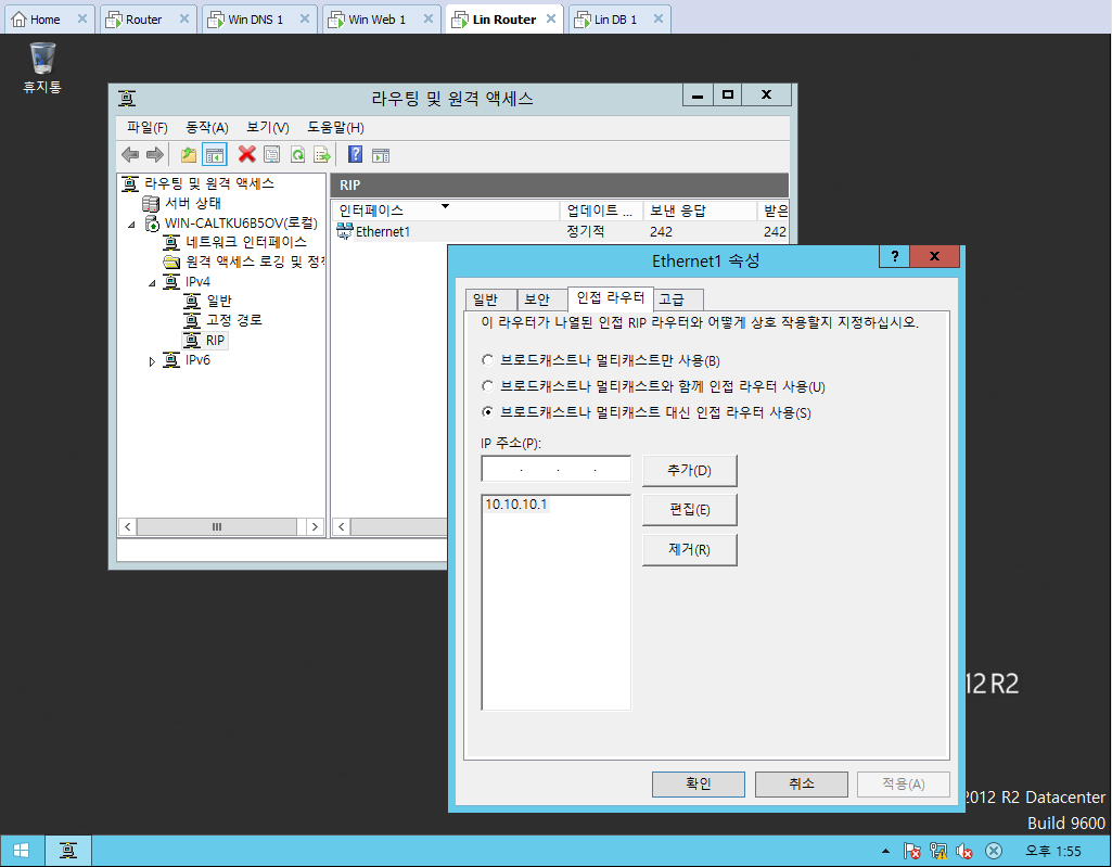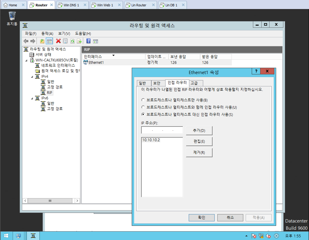 - rrasmgmt.msc에서 RIP 사용 인접라우터 등록