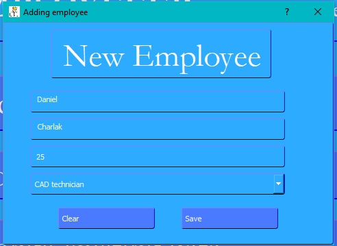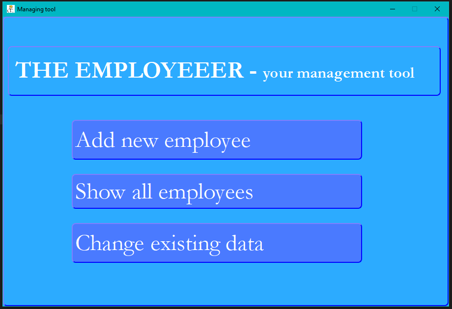 PROJECT CAN BE DOWNLOADED AS A ZIP FILE WITH A EXE !! JUST DOWNLOAD "Employeeer v1.0.0" from releases section and try it. No additional installation is needed, just unpack and run exe file.