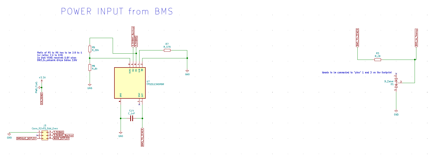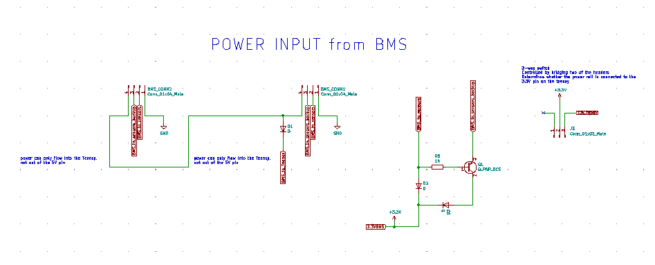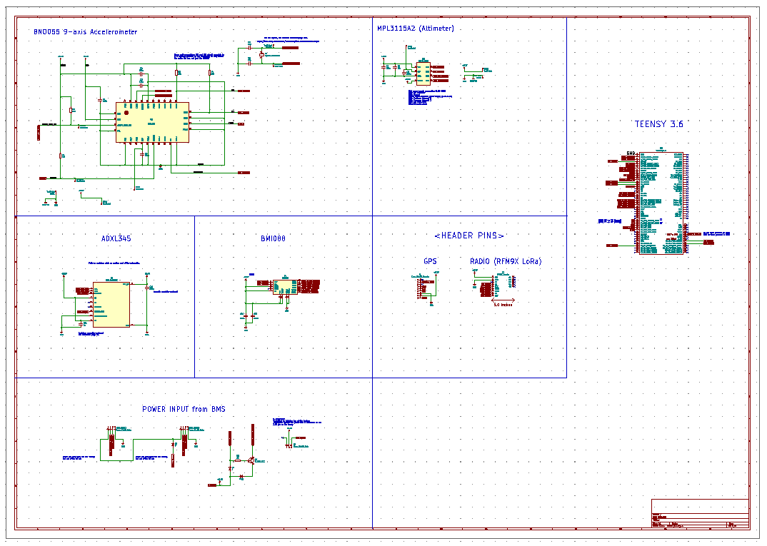 - Now all the schematics can be hooked up together; in this case it means connecting each sensor’s communication pins to the Teensy and power and ground to the power supply. A small circuit for regulating the power supply from the BMS, as well as header pins for the BMS and GPS and radio breakout boards are also added to this schematic.