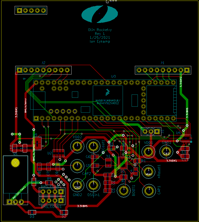 The COTS computer is a _ model. It has its own batteries, sensors, and radio and can trigger the recovery system independently. It is intended as a backup and is required by IREC competition rules (partly so they have a reliable altitude measurement for the competition). The BMS is described on the Power Management subteam page. It can suppy a steady 3.3V current up to about 1000 mA to the student-designed flight computer board.