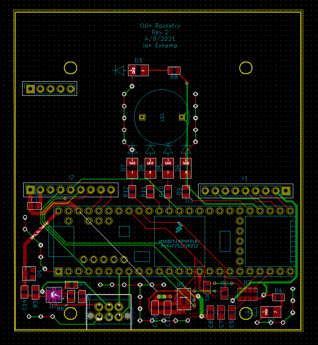 With the ADXL345 and MPL3115A2 sensors confirmed to work, the main objective of the Rev 2 board is to make it fit into the avionics bay. The final board is 80mm tall by 72mm wide and has a mounting hole in each corner. The power supply transistor circuit has been replaced with a power multiplexer, a zener diode was added for overvoltage protection, and the power from the BMS goes directly into the Vin pin on the Teensy; the sensors and other circuitry are powered by the Teensy's 3.3V pin as discussed above. Additionally, 5 debugging LEDs, one power LED, and a buzzer have also been added and are controlled by spare digital pins on the Teensy. A 10uF capacitor was added between the power and ground pins of the radio upon testing by the Communications team.