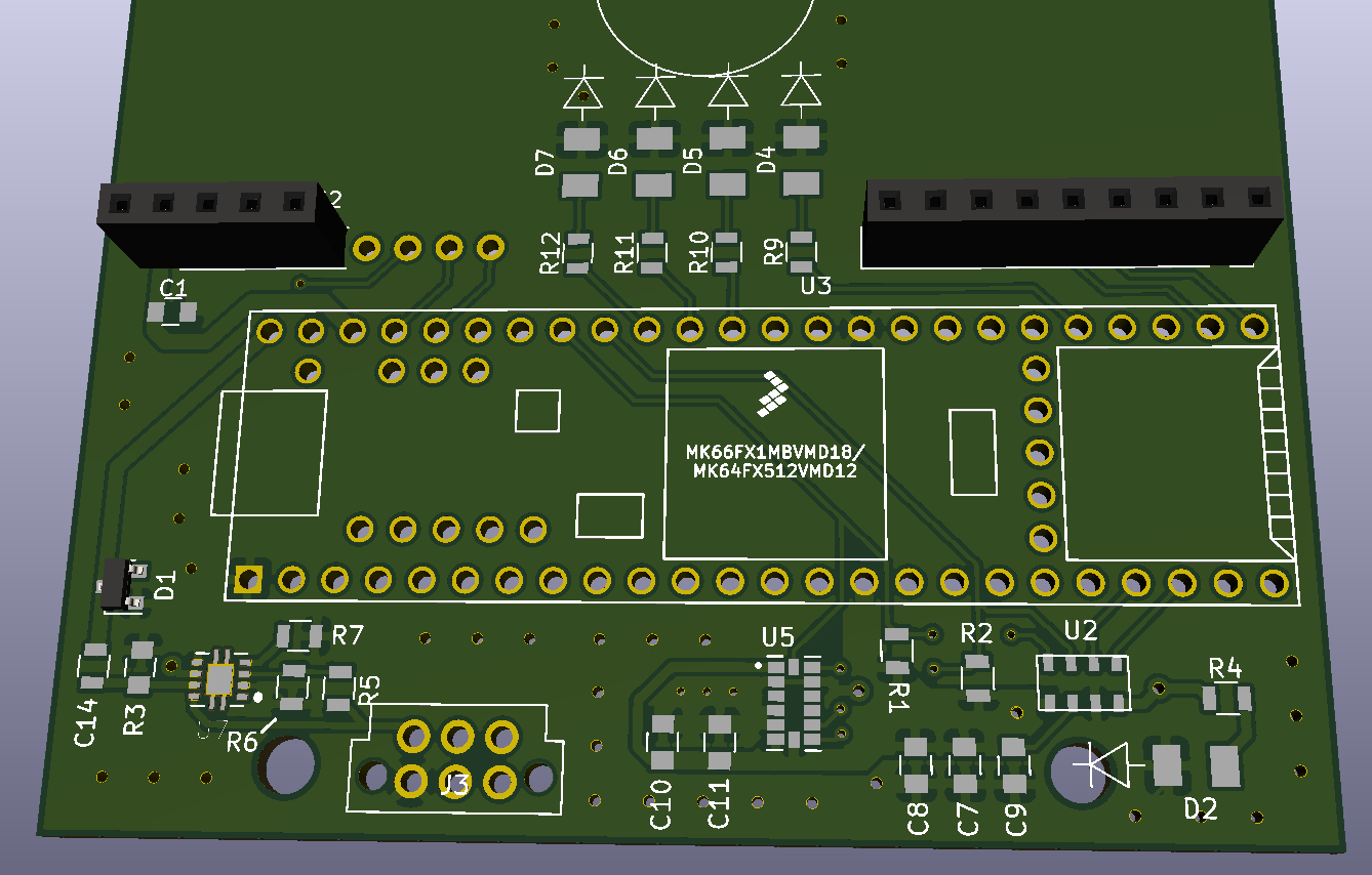 - The layout of all the components for the final PCB is created. You cannot copy and paste the layouts created earlier for individual sensors, but you can follow the prior layouts as a guide. For the Rev1 board, we kept the components in the same relative orientation but did not pack them as closely together, to make debugging and potential fixes easier. During the layout process, it will probably make sense to swap the order of some pins connected to the microcontroller, in order to untangle the traces, or reduce the number of times traces have to cross over. Most pins on the Teensy 3.6 can function in the same way, so switching which pins are connected to which sensor is not a problem. Be careful not to switch the order of SCK and SDA; MISO and MOSI; or RX and TX; these pins are not interchangeable.